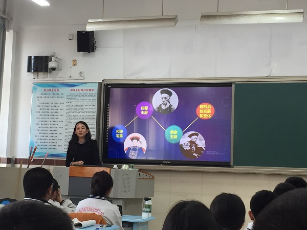 2015级博士生支部刘惠、郭蔚然、张泓林为高二理科班授课。主讲人刘惠围绕恭王府这一主题,以恭王府的概况、等级规制、主人变迁、满族萨满信仰、恭王府所体现的娱乐生活及恭王府的建筑文化等几个话题为主线。同时与恭王府的具体建筑如锡晋斋、大戏楼、后罩楼等相结合,讲述了恭王府的历史与文化。2015级硕士生第一党支部白佳鑫、苏浩浩、窦芳丽为高二一班、二班授课。主讲老师白佳鑫以“一座恭王府,半部清朝史”为主题,将恭王府的历史变迁分为和珅时期、奕?时期和共和国建立后的时期三个阶段。不仅使学生了解了恭王府的基本建构,还与清朝中后期的衰落、晚清第二次鸦片战争、洋务运动等重大历史事件相联系,丰富了学生对中国近代历史的认知。2015级硕士生第二党支部段钰山、左会平、许若潇为高二三班、四班授课,由段钰山任主讲老师。她以“恭王府的前世今生”为题,讲解了恭王府的历史沿革,介绍了和珅宅第、庆郡王府和恭亲王府。紧接着,段钰山详细讲解了恭王府解放后的发展、变化以及恭王府的文化底蕴。同学们积极配合三位老师,课堂氛围活跃,师生互动频繁。