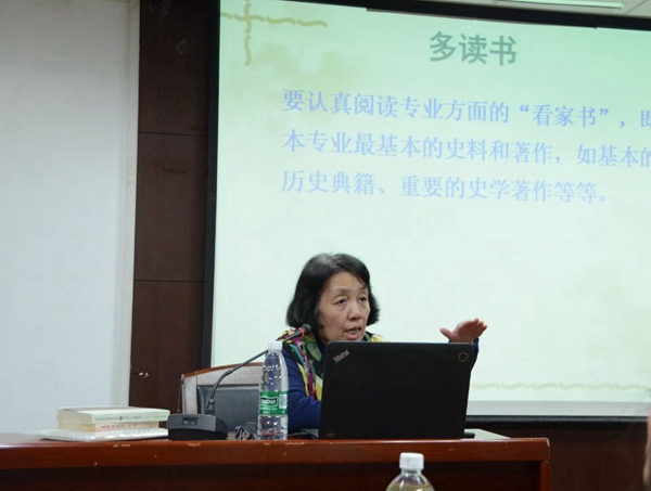 李志英老师从多年任教经验和自身学术积累出发,分别向同学们阐述了五个问题。第一是学术规范的含义。李志英老师认为学术规范就是学术研究规范,是学术研究过程中应该和必须遵循的一些规定、规矩和规则等。其中,李老师尤其强调了在学术研究中一定要谢绝剽窃,学术创造一定要是原创。第二是多读书的问题。李志英老师首先向同学们说明了读书对于研究的重要意义,随后介绍了一些行之有效的读书方法。她认为,最重要的是要认真阅读专业方面的“看家书”,即本专业最基本的史料和著作等,但同时也应该兼顾其他相关学科的著作,在此李老师特别强调了同学们在学习中需要看前人的专著和文章,尤其是经典和名著,要用竭泽而渔的态度来对待读书这件事。接下来李老师分别详细介绍了阅读理论书和史料的具体方法,还列举了自身阅读的事例,使同学们对“读书”有更加直观的了解。第三是怎样做读书笔记。在读书笔记方面,李老师主要介绍了两种方法,一是卡片分类法,二是在阅读时记下最触动自己的部分,并且做必要的分析和评判。第四是怎样写读书报告的问题。在此问题上,李老师突出强调了逻辑问题,她认为,同学们在写报告时,首先应该介绍该著作的作者,尤其是作者的学术思想和学术履历,学会知人论世。其次是介绍书的内容,在阐述内容时,着重把握著作的中心论点和次级论点,理清作者的构思思路。在写作过程中,李老师还建议同学们要学会思考,学会问问题,从中得出结论,这一思考的过程也是自己做研究的锻炼。最后一个是撰写学术论文的规范问题。李老师认为,在撰写论文中,摘要不能写成缘起,摘要是论文的简要概括,更应清晰明朗,同时,论文也需要有研究回顾,在对前人的总结中再提出自己的新观点。李老师也阐述了标题对于论文的重要性,她认为标题必须要讲究,要新颖。随后她还详细地向同学们讲解了如何规范注释和参考文献的格式问题。