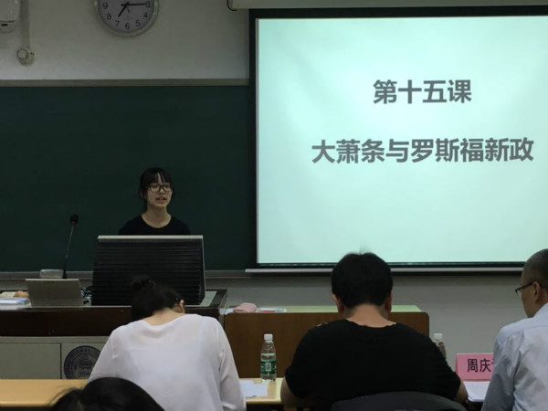 第一分赛场,首先登台的王菲同学以其温和的语言开启了《大萧条与罗斯福新政》这一课,在展示期间穿插了图片与各种资料用以解释课本中的抽象知识。紧接着潘黎明同学带着极强的气场登台,用较科学的知识与严谨的语言,向同学们介绍了《夏商西周的政治制度》。第三位登台的便是李师孟同学,这名同学以其幽默风趣的风格引来同学们的阵阵笑声,并且在李同学的讲述中灵活使用各种史料。第四位上台讲课的是孙雅薇同学,她的课题是《宋金南北对峙》,在授课过程中,孙同学采用了各种教学方法,使得课堂灵活生动。第五位上台的是田丽丽同学,她授课的题目的是《世纪之交的世界格局》。田同学的讲课清晰明了,各个层级划分较清晰,并且在课堂中与同学们的互动良好,这节课顺畅舒服。最后一位上台的便是郭家玮同学,她选择的题目是《古代希腊民主政治》。郭同学对于知识的处理得较清晰,讲述流畅,逻辑清楚。