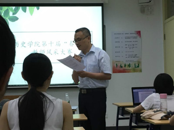 5月18日19:00,由历史学院研究生会主办的第十届“春晖杯”教师风采大赛在教二401、409教室顺利举办。本次比赛邀请了历史学院马卫东老师、李凯老师、周庆许师兄、蔡妍妍师姐、肖雪师姐和李皎乐师姐担任评委,来自不同年级的多名同学参加了本次比赛,气氛活跃。