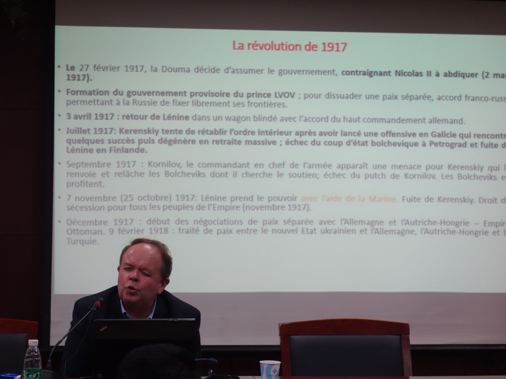 5月27-30日,应bet365体育在线邀请,法国国家海军史研究中心首席专家、知名学者亚历山大.谢尔东-杜普莱教授(Alexandre Sheldon- Duplaix)来我校访学。5月29日下午,杜普莱教授在主楼600会议室作了题为“1917年前的沙俄海军”的学术讲座。本次讲座系我校励耘学术讲堂历史学系列讲座之一,也是纪念俄国十月革命100周年专题学术活动的重要部分。讲座由历史学院世界近代史教研室江天岳博士主持,历史学院世界近现代史研究中心主任张建华教授、世界现代史教研室主任安然老师、世界现代史教研室王广坤老师等出席了讲座。