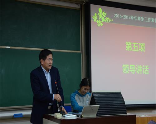 大会首先由姜海军老师宣读2016-2017学年本科生国家奖学金、国家励志奖学金、京师奖学金、专项奖学金、社会奖学金以及三好学生等荣誉称号获得者名单;王卓凯老师宣读2016-2017学年研究生国家奖学金、学业奖学金、专项奖学金、社会奖学金等荣誉称号获得者名单。随后进行大会第二项,陈殿老师宣读白寿彝史学论著奖本科生组获奖名单。大会第三项流程是2017年度学生工作颁奖,在播放历史学院2016-2017学年学生工作回顾展示视频后,郭家宏老师对一年来的学生工作做了总结,并宣读了各项市级及校院两级学生工作教师、集体类奖项获奖名单,郭家宏老师、姜海军老师、王卓凯老师为获奖代表颁奖。湛晓白老师和朱敏老师分别宣读了校级和学院学生工作获奖学生名单。郭家宏老师、姜海军老师、王卓凯老师为获奖代表颁奖,并与获奖代表合影留念。